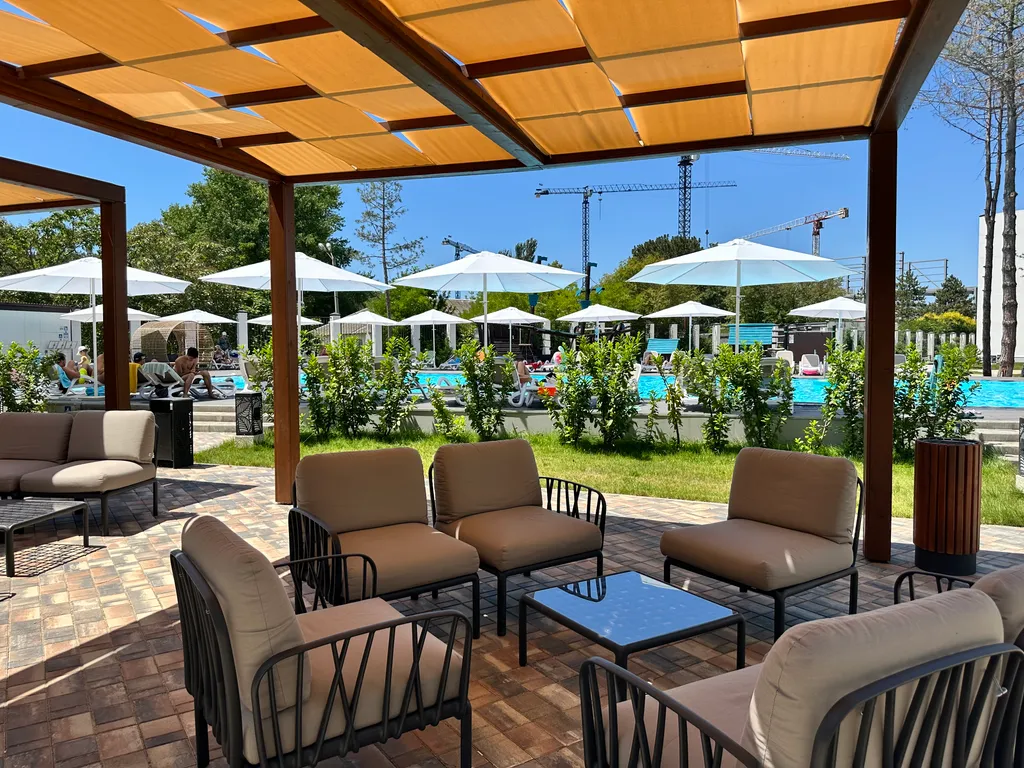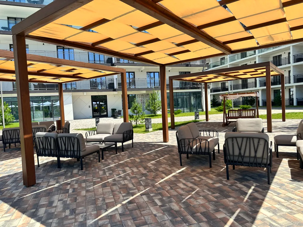 Внутренний двор-сад «без машин» функционален и безопасен, под видеонаблюдением с уютным ночным освещением. Парковка бесплатная вокруг резиденции. Бассейн бесплатно. Во дворе организованы: тренажерный зал, игровая, спортивная, для отдыха, пикника и медитации зоны. Wi-Fi на всей территории. Всё бесплатно. Лобби-бар с напитками и закусками. Завтраки (900 р.) (континентальные, шведская линия) и обеды (1200 р.). Фитнес-зал, детская комната, ресторан работает.