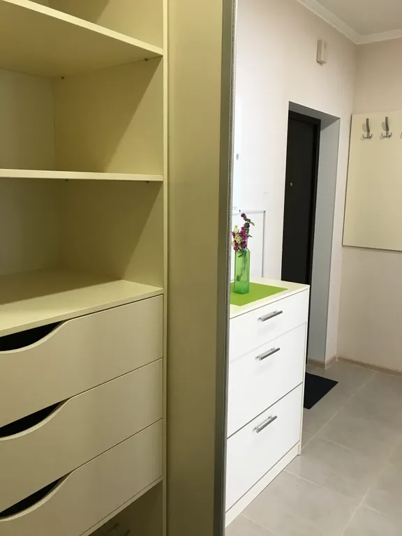 Прихожая оборудована гардеробной с зеркалами во всю стену, где с лёгкостью разместятся ваша одежда и обувь. Имеется пылесос, гладильная доска, сушилка для белья.