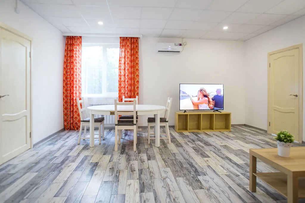 Санузлы: 1 этаж — туалет с душевой кабиной/ванной. Уборка номера ежедневно. Смена белья раз в 3–4 дня. Комплектация номера: телевизор (1) в гостиной, сплит-система в каждой комнате и гостиной, стиральная машина, микроволновая печь, чайник, холодильник, фен, комплект полотенец.