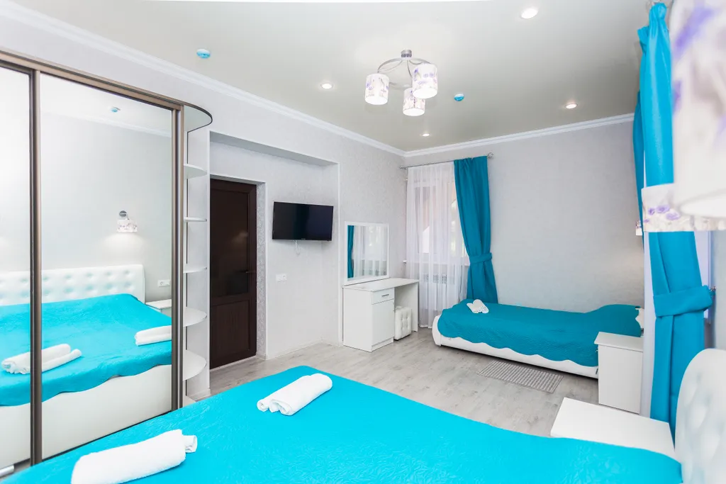 В спальне двуспальная кровать, односпальная кровать, прикроватные тумбочки, письменный стол, платяной шкаф, телевизор, сплит-система.
