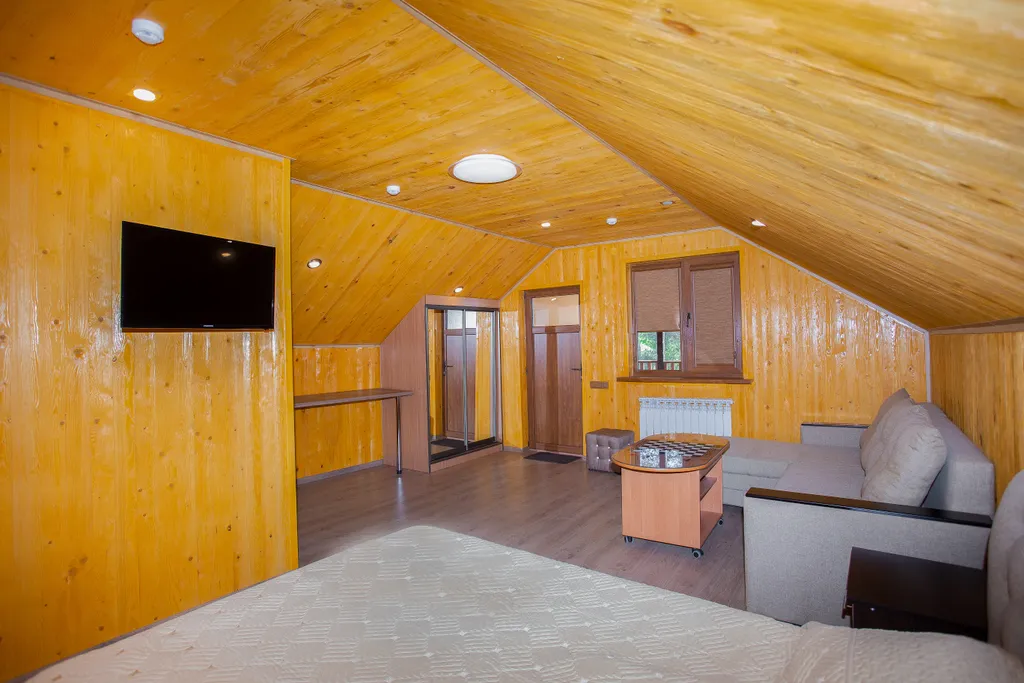 На втором этаже двуспальная кровать, диван, раскладывающийся на два спальных места, журнальный столик, шкаф-купе, холодильник, телевизор, сплит-система.