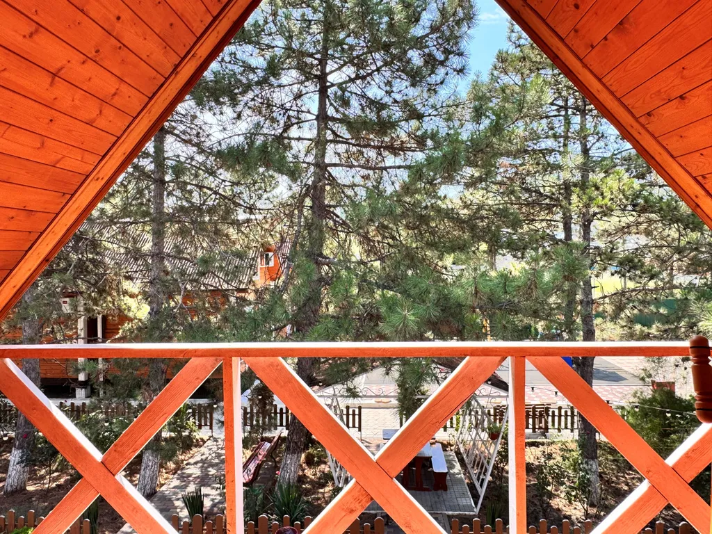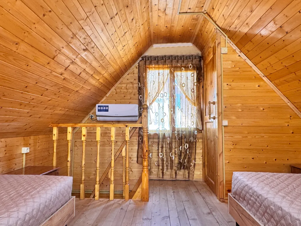 Второй этаж: 2-сп кровать, 1-сп кровать, тумбочки, санузел, балкон.