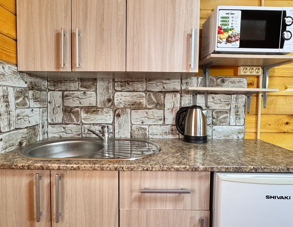 Первый этаж: 2-сп кровать, кухня (посуда, эл.чайник, микроволновая печь, холодильник), ЖК-телевизор, сплит-система, санузел и душевая.