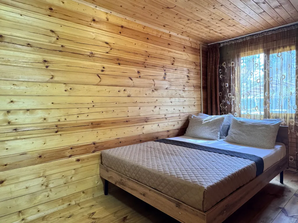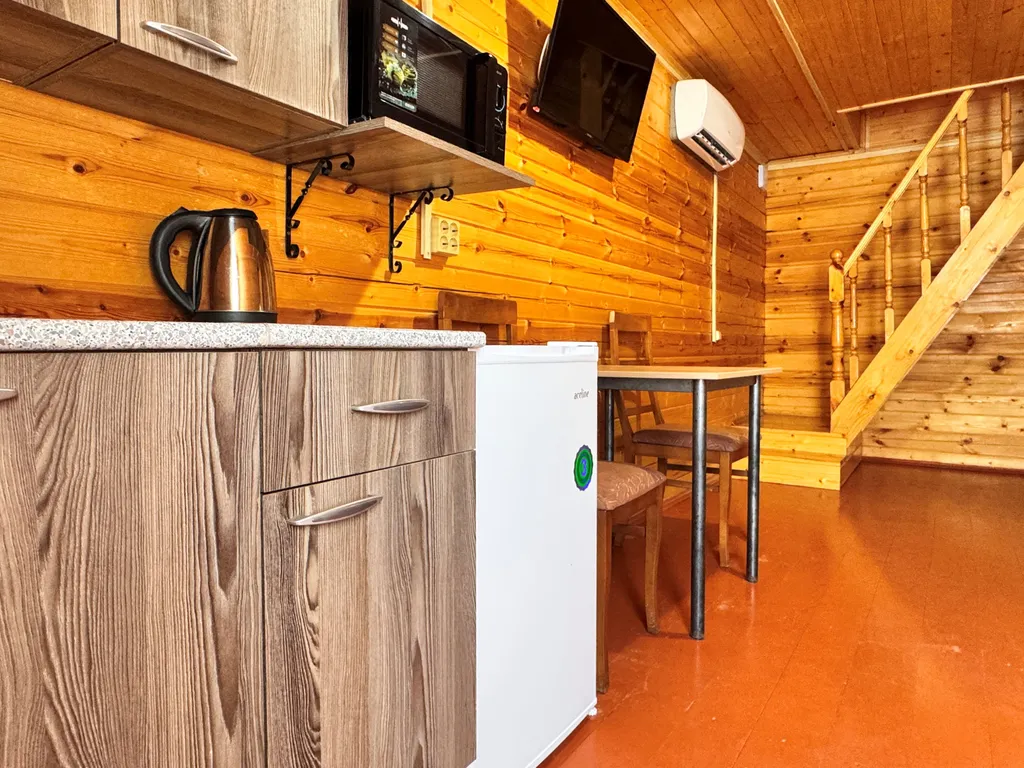 Первый этаж: 2-сп кровать, кухня (посуда, эл.чайник, микроволновая печь, холодильник), ЖК-телевизор, сплит-система, шкаф, санузел и душевая.