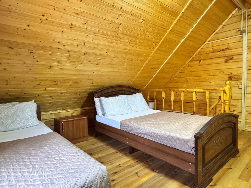 Второй этаж: 2-сп кровать + 1-сп кровать или три 1-сп кровати, тумбочки.