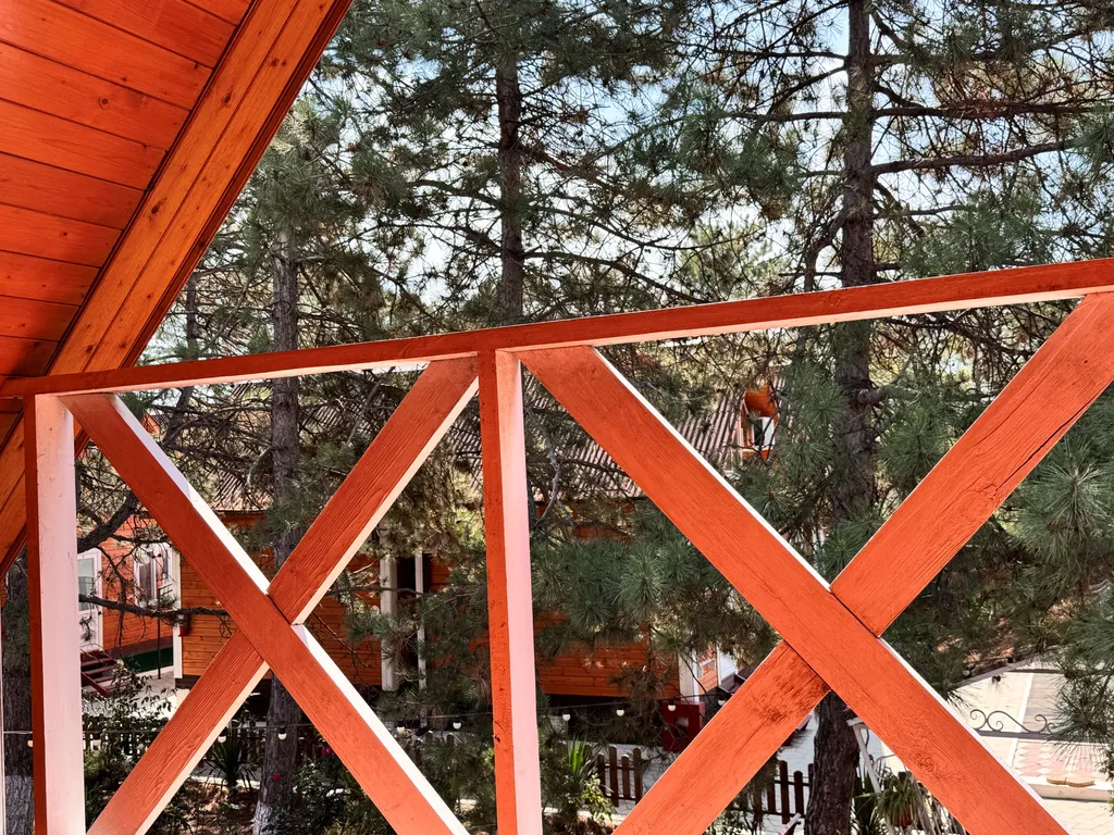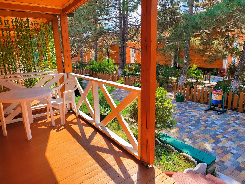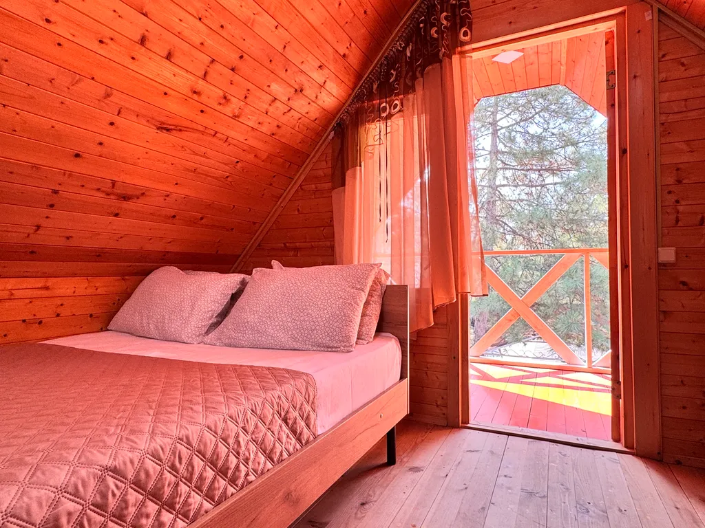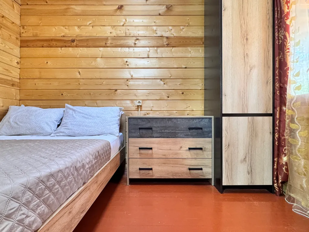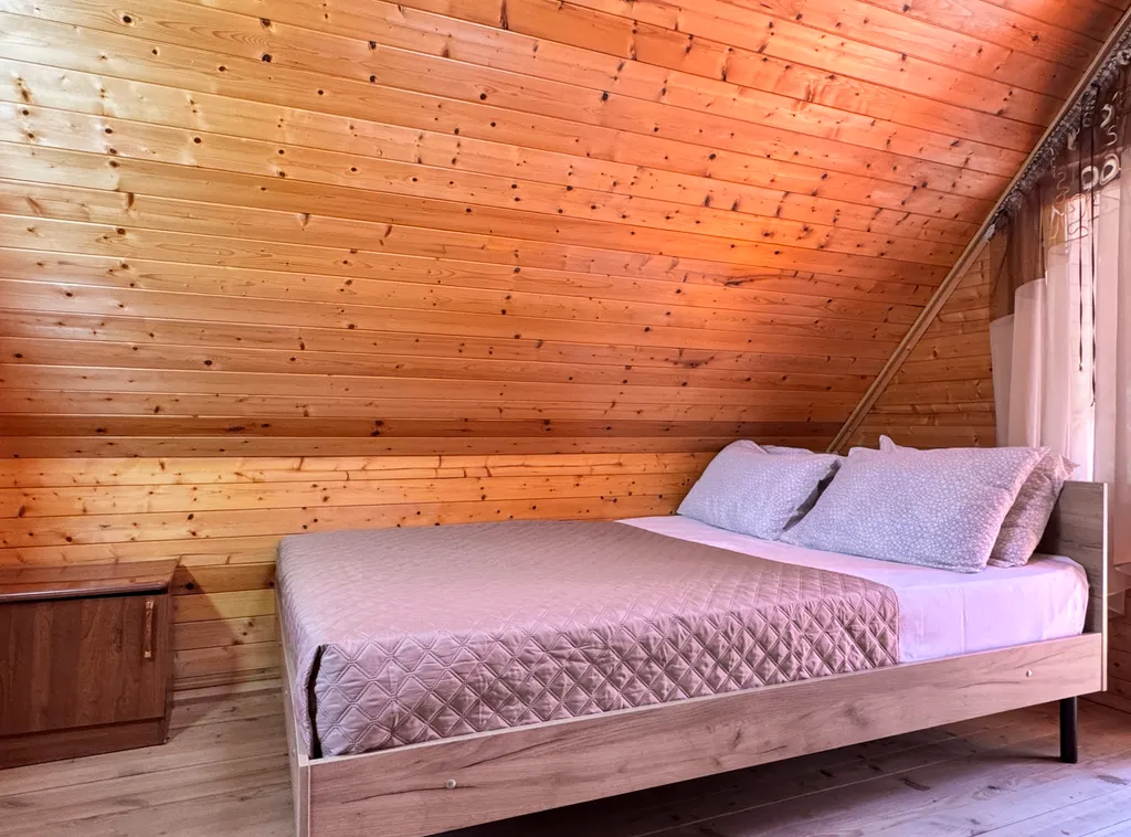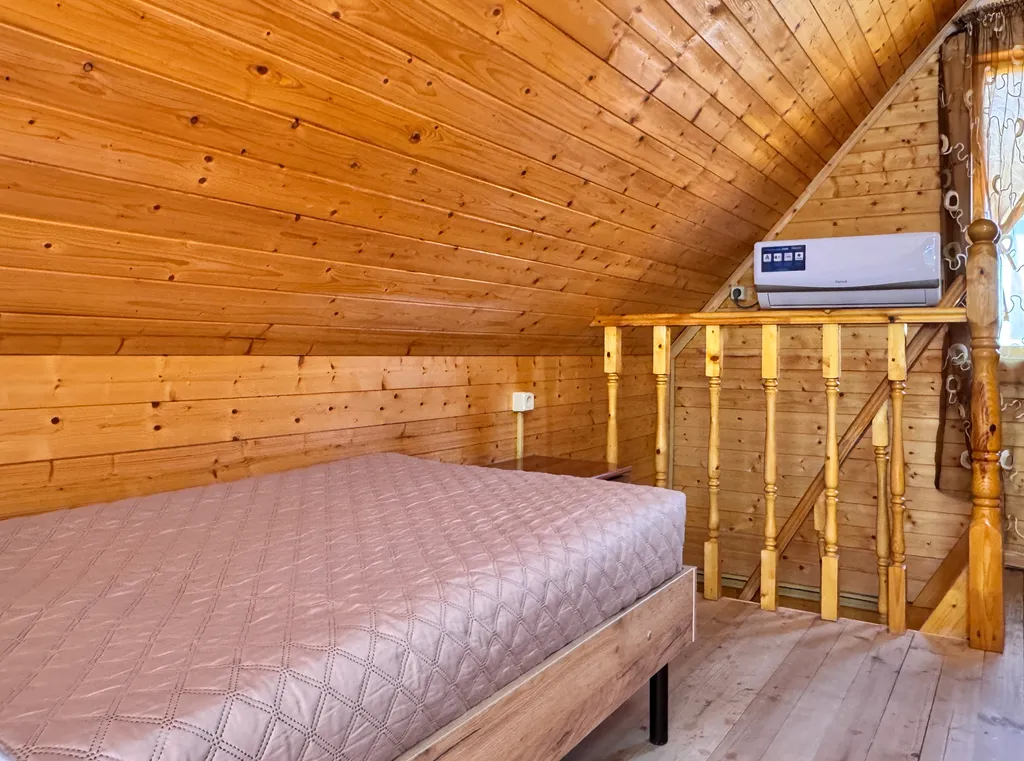 Второй этаж: 2-сп кровать, тумбочки, санузел, балкон.