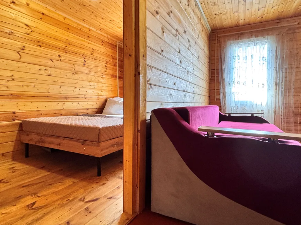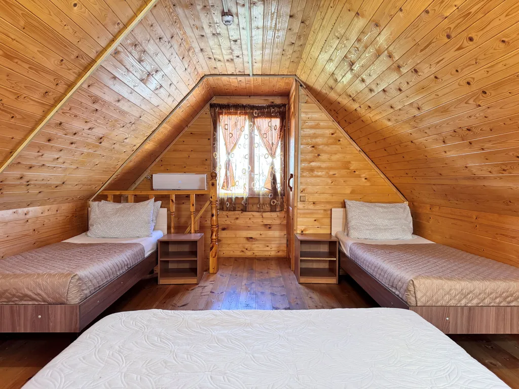 Второй этаж: 2-сп кровать, две 1-сп кровати, тумбочки, санузел.