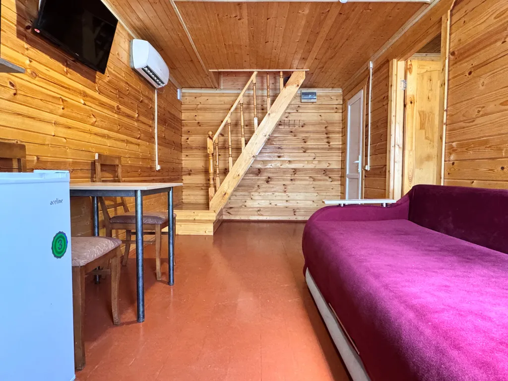 Первый этаж: 2-сп кровать, 2-сп диван-кровать, кухня (посуда, эл.чайник, микроволновая печь, холодильник), ЖК-телевизор, сплит-система, шкаф, санузел и душевая.