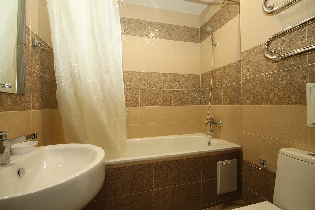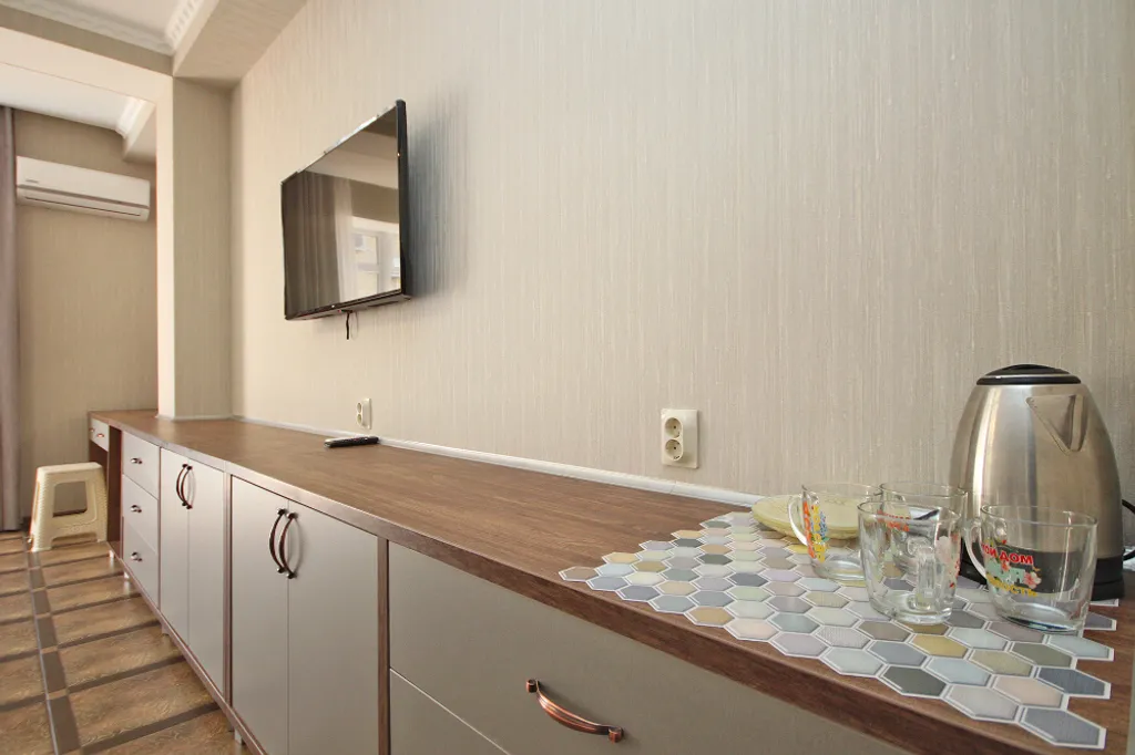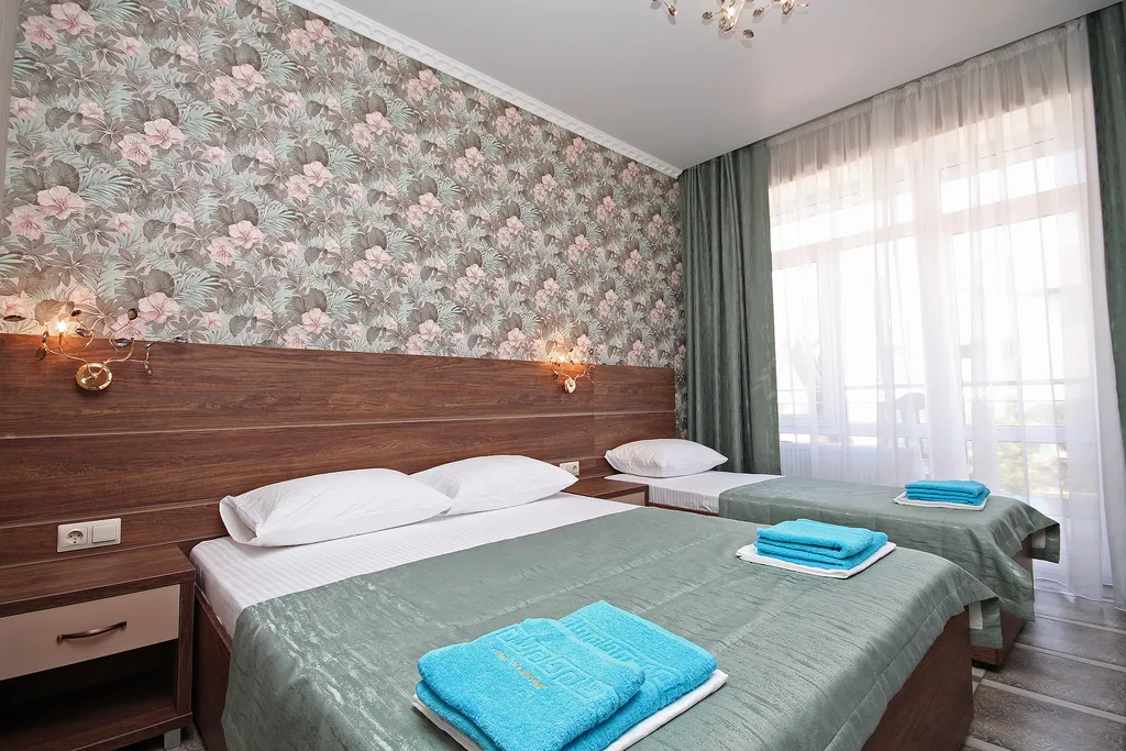 В номере: двуспальная кровать + односпальная; тумбочки, будуарный столик, ЖК телевизор, холодильник, сейф, фен, сплит-система кондиционирования воздуха, совмещенный санузел (туалет, раковина, ванная).