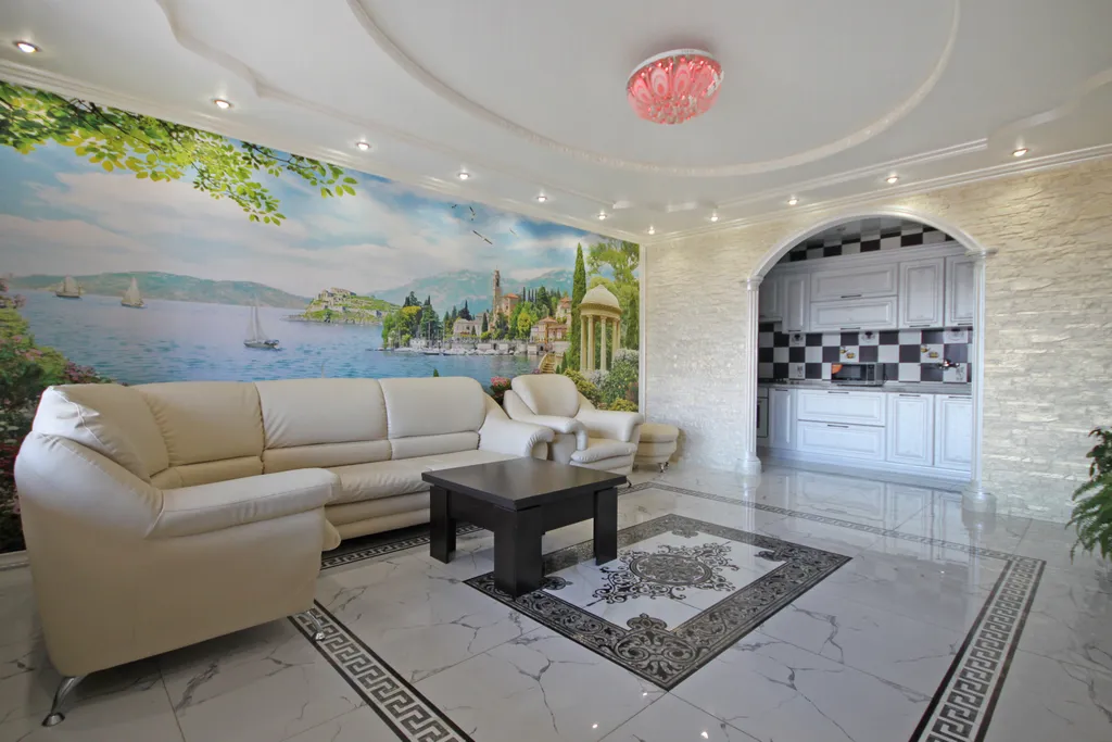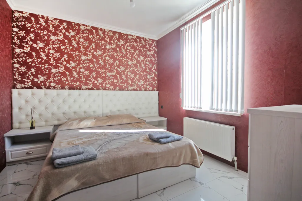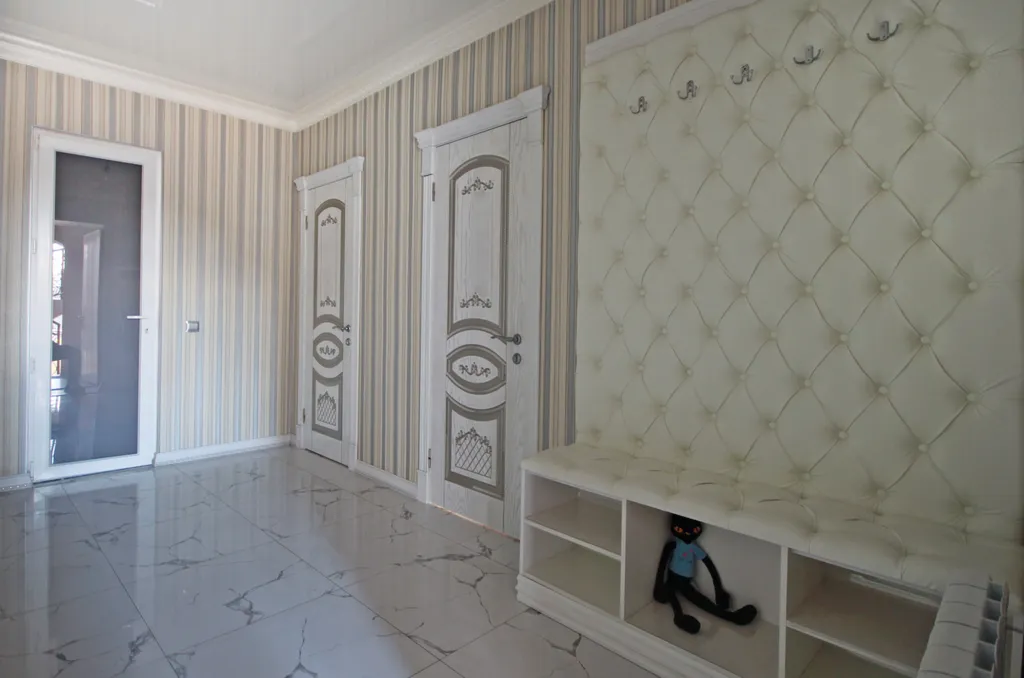 В спальне: двуспальная+односпальная кровать, тумбы, шкаф, будуарный столик, телевизор, сплит-система.
