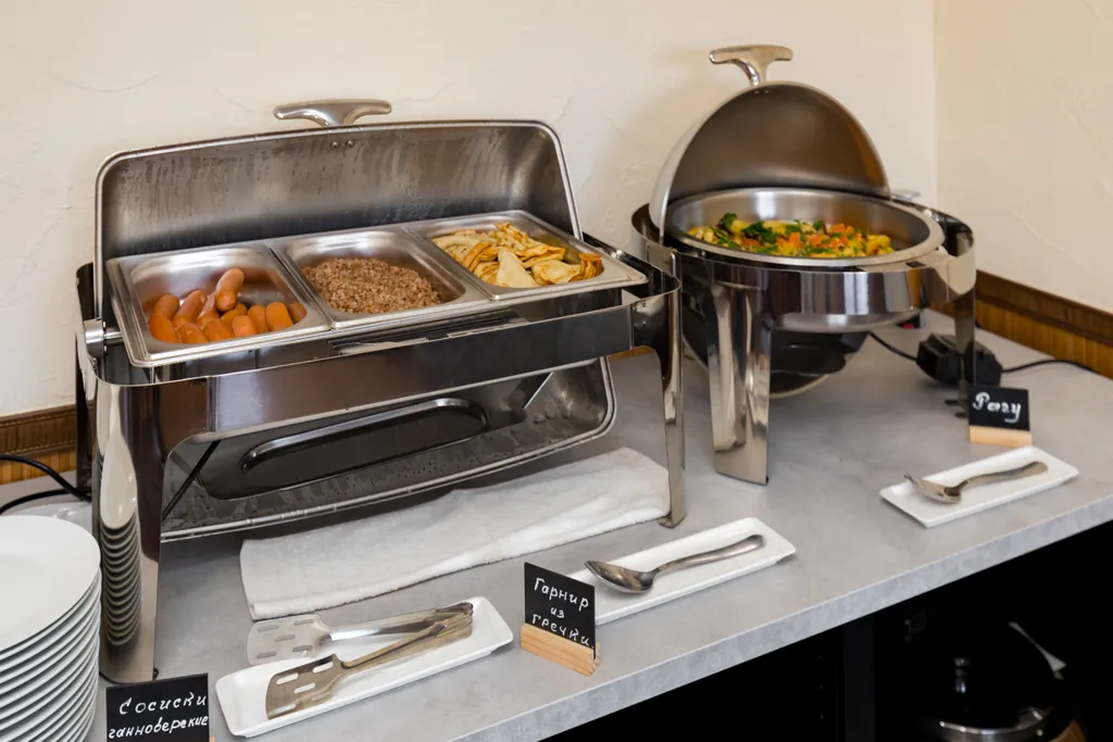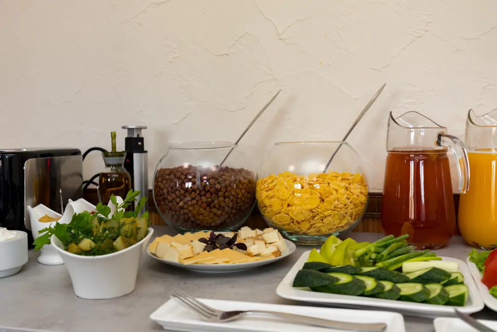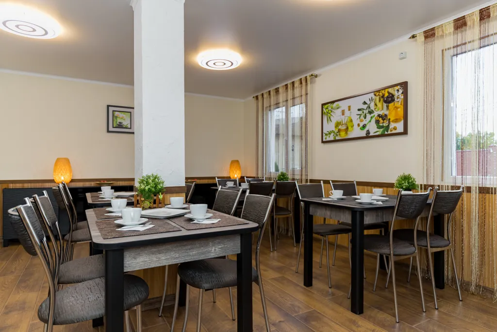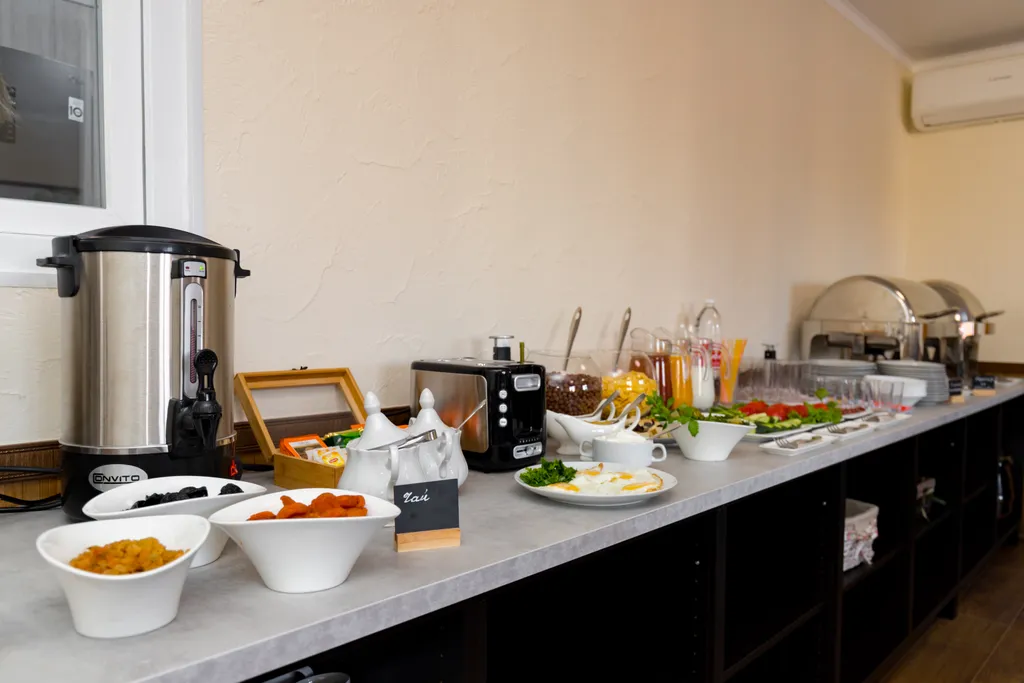 В уютной столовой накрывают завтрак по системе «шведский стол», также в номерах имеются станции для приготовления чая/кофе.