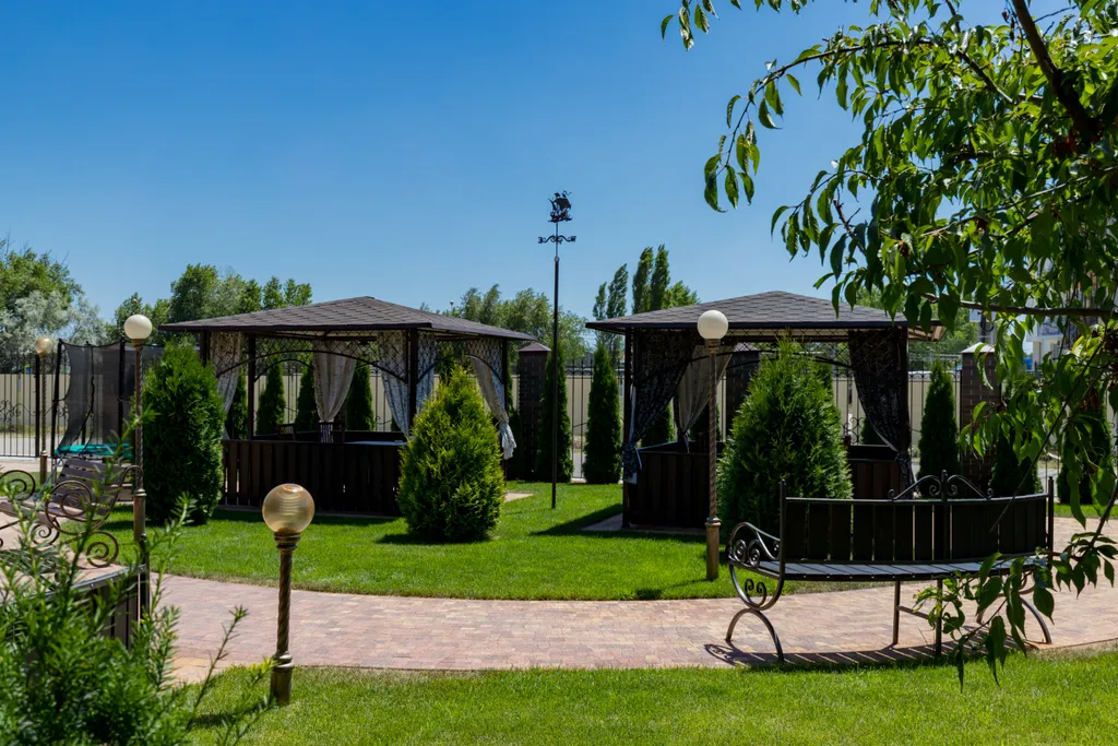 Зелёная территория дома и находящиеся на ней уютные беседки с плетенной мебелью, располагают к размеренному отдыху.