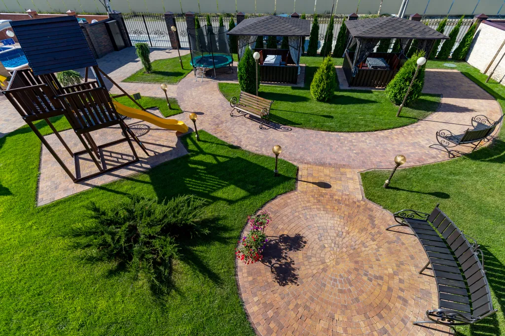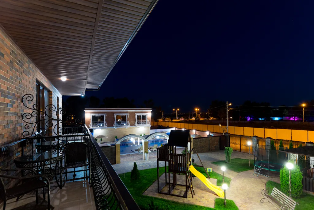 Имеется зона барбекю и уютные беседки с плетеной мебелью. Для детей — игровой домик с горкой и батут.