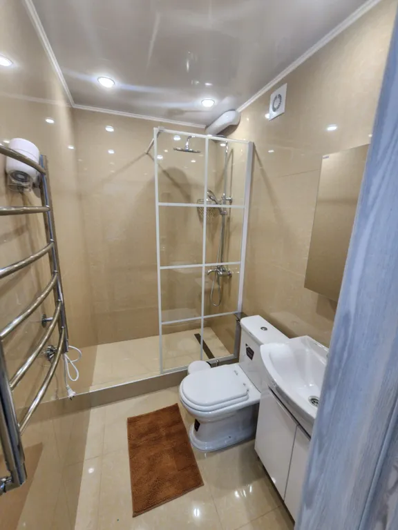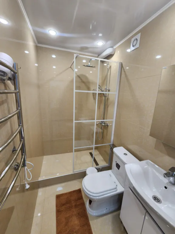 В ванной комнате : душевая кабина с тропическим душем, унитаз, стиральная машина, полотенцесушитель, фен для волос.