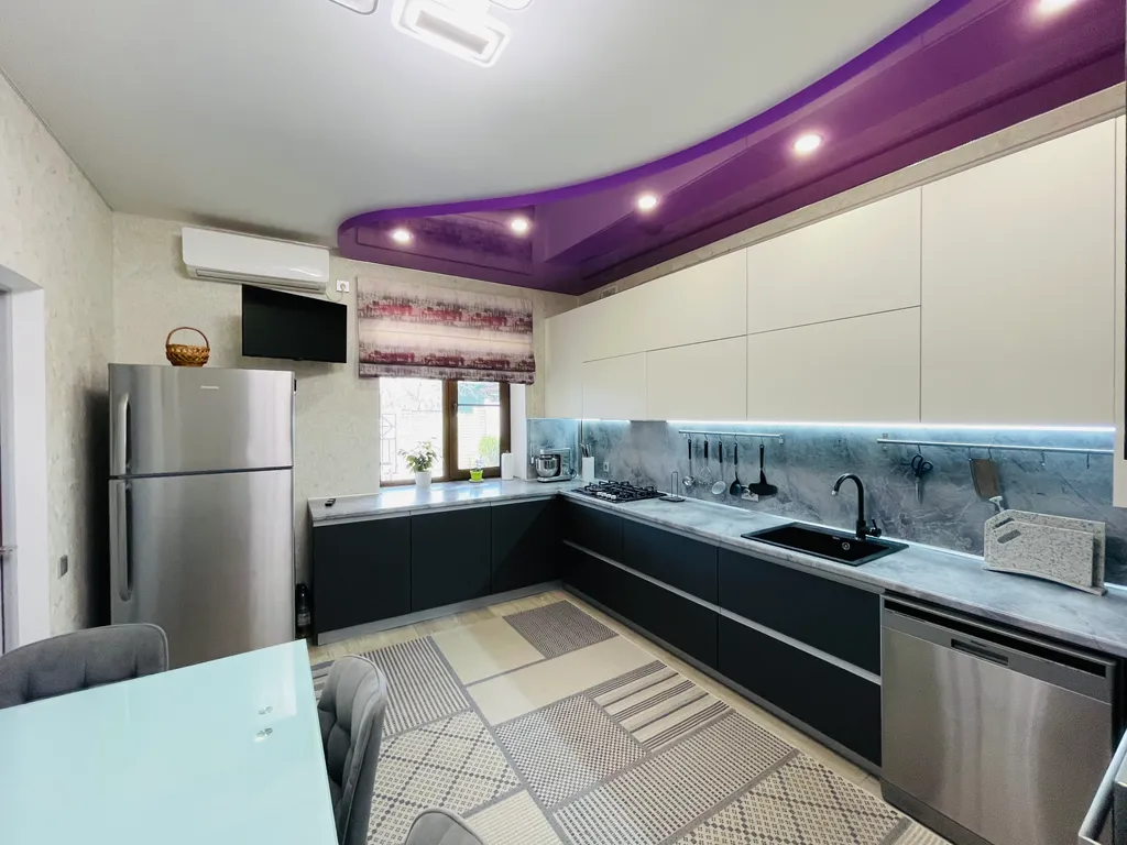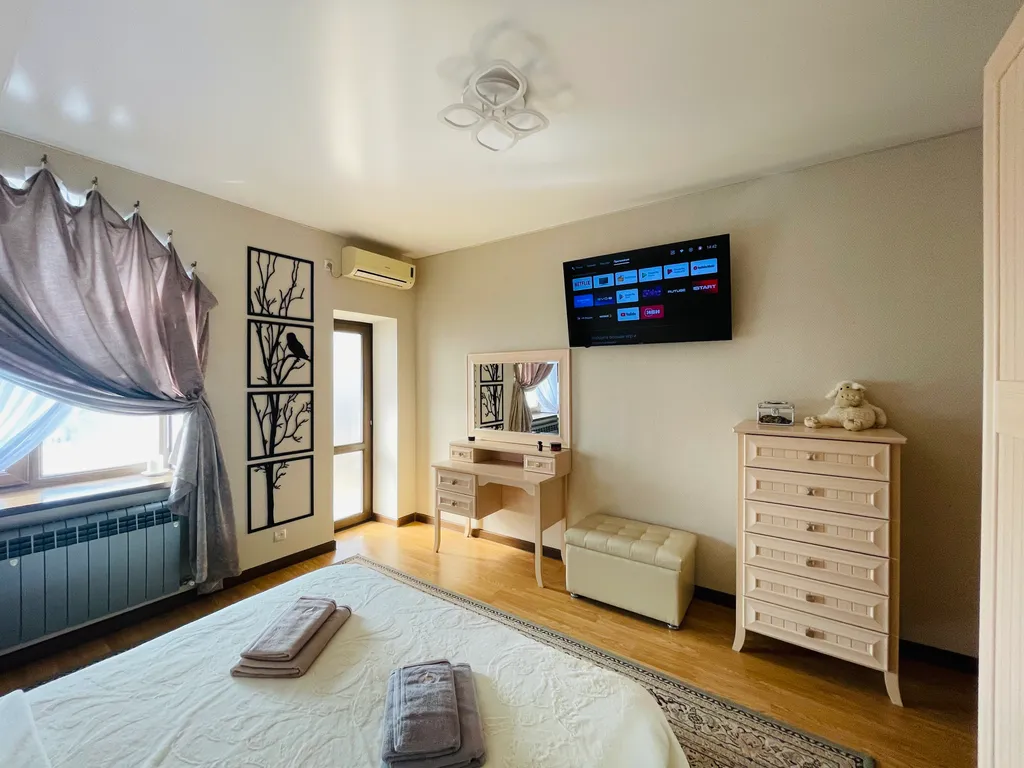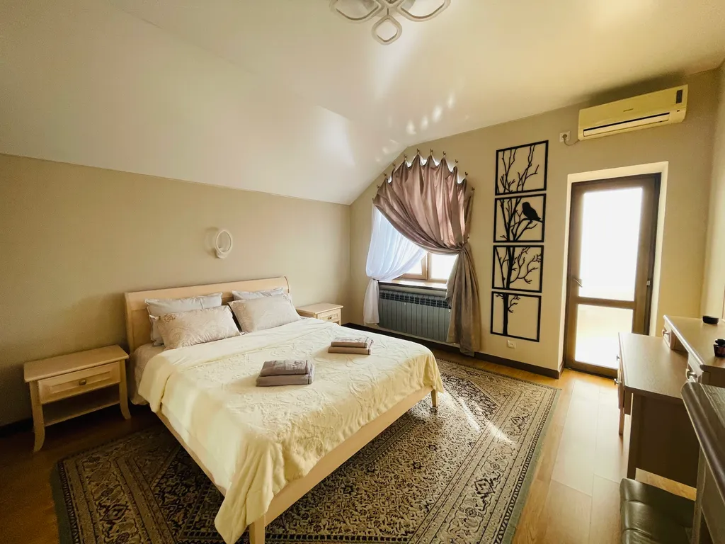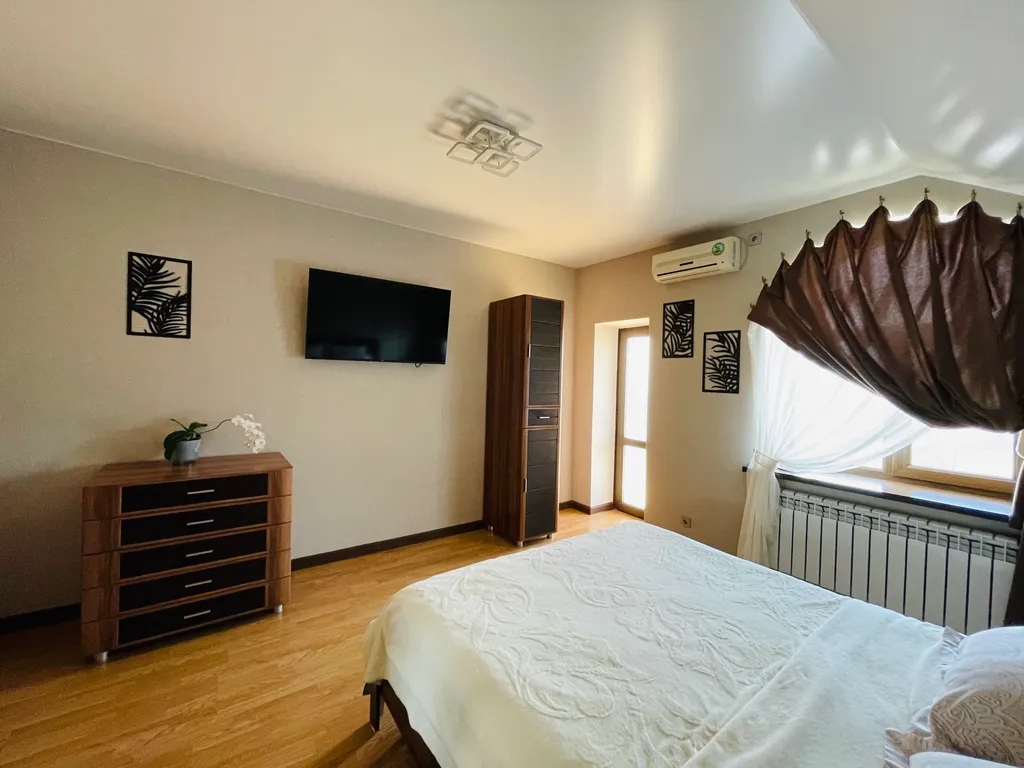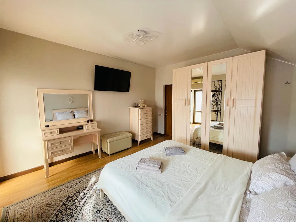 Четыре полноценные просторные спальни, в каждой двуспальные кровати с ортопедическими матрасами, приятное, качественное постельное бельё, вся необходимая мебель. В каждой комнате, а также и на кухне, сплит-система, что не маловажно в сезон, когда температура воздуха доходит до 40 и выше градусов. Так же в каждой комнате и на кухне телевизор. Современная кухня, оснащена всем необходимым и даже больше - зерновая кофе машина, аэрогриль, электрический чайник, тостер, микроволновая печь, электрическая духовка, посудомоечная машина и т. Д. Если вы планируете на отдыхе готовить самостоятельно, то на кухне найдется все что позволит процесс готовки сделать лёгким и быстрым, и не придется сетовать, что нет овощичистки, миксера или отсутствует ёмкость для маринования шашлыка.