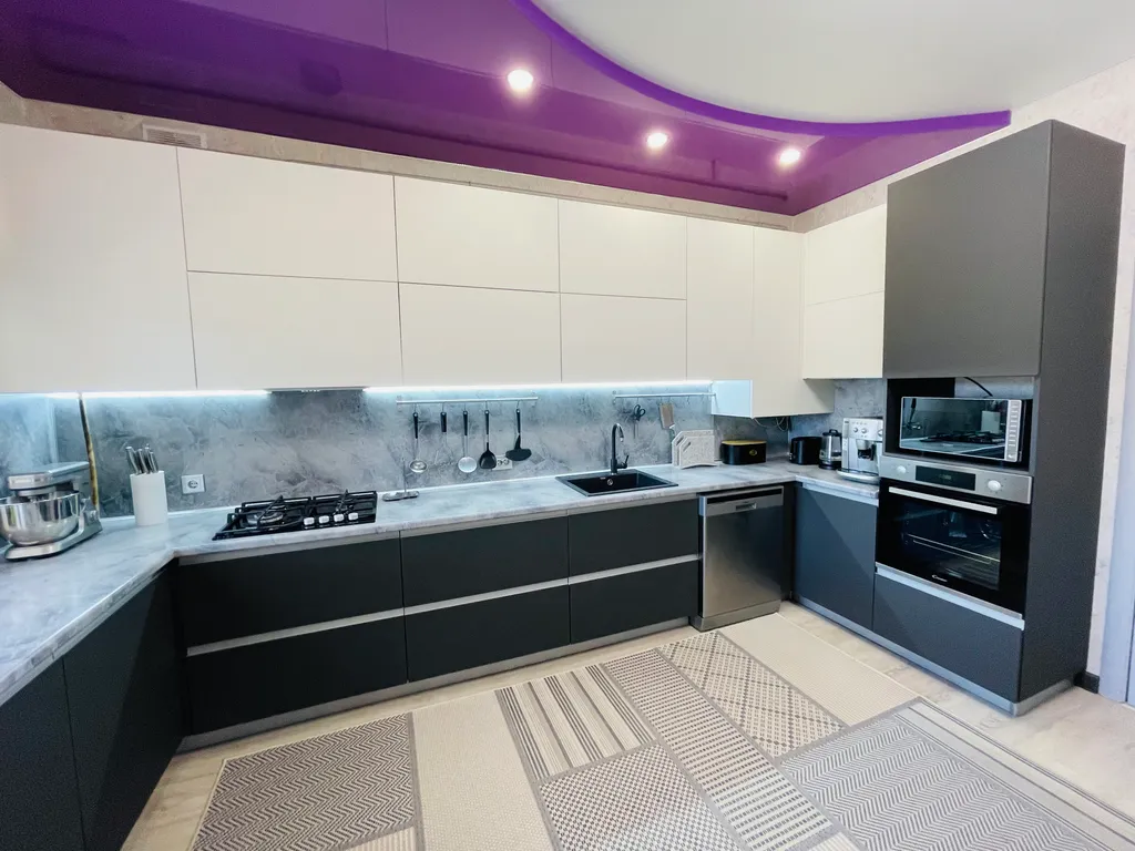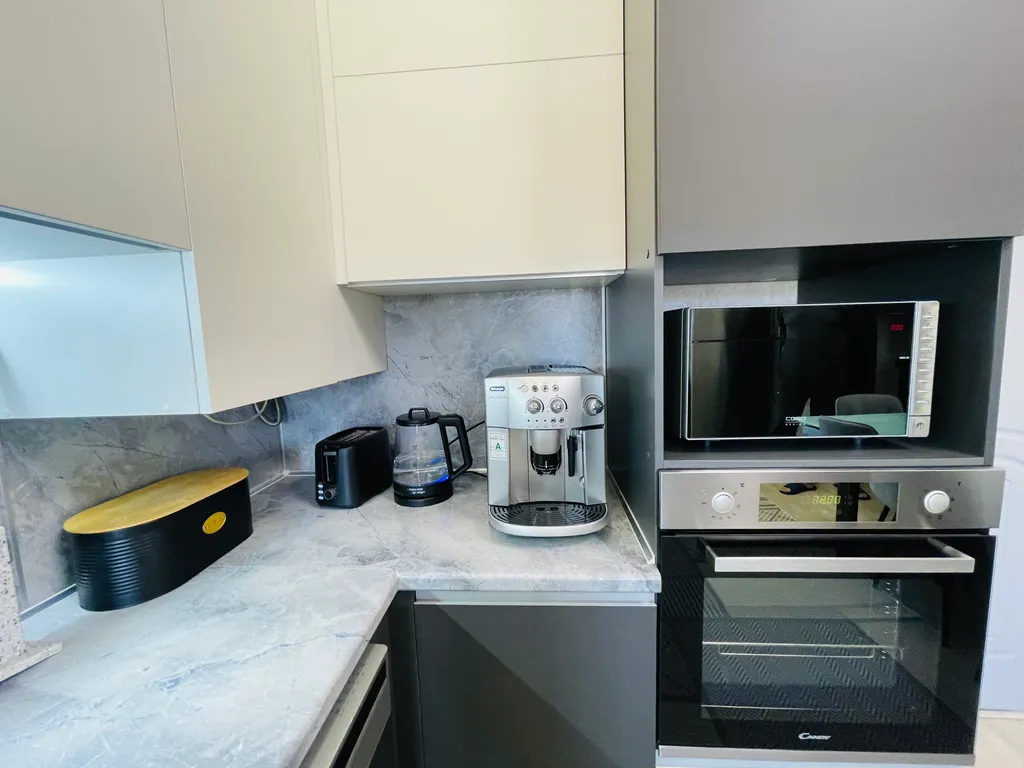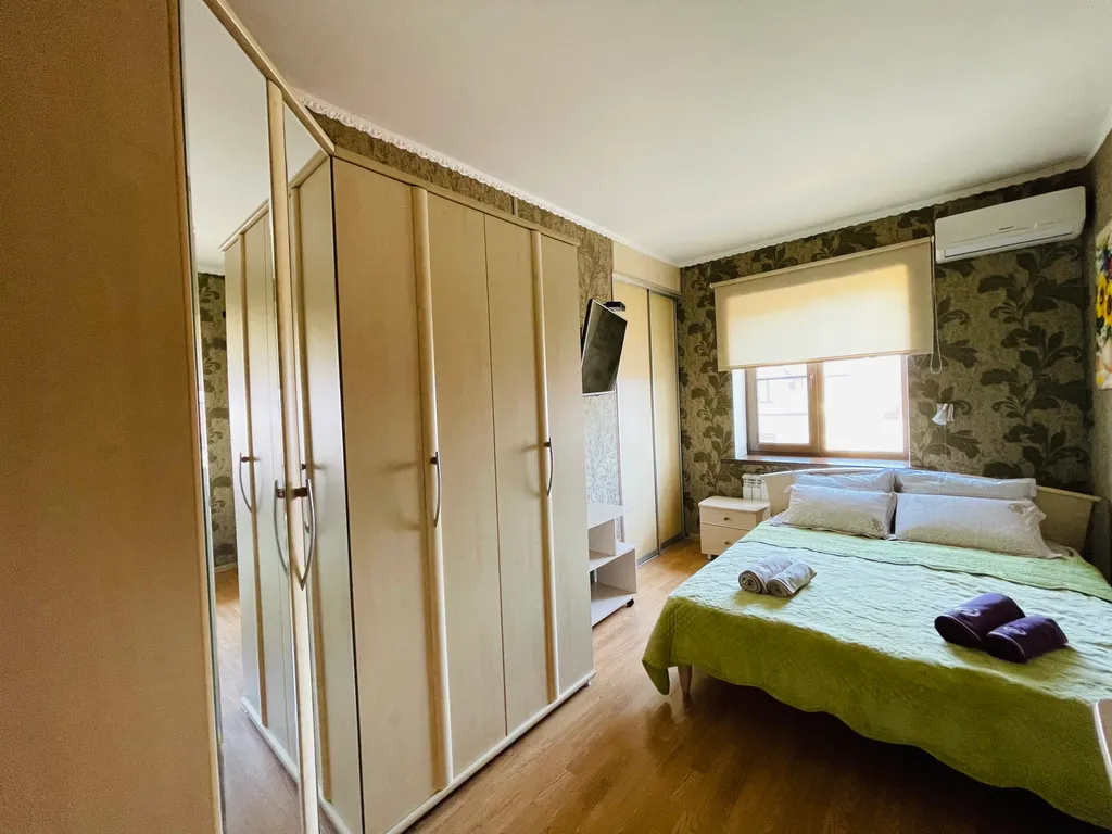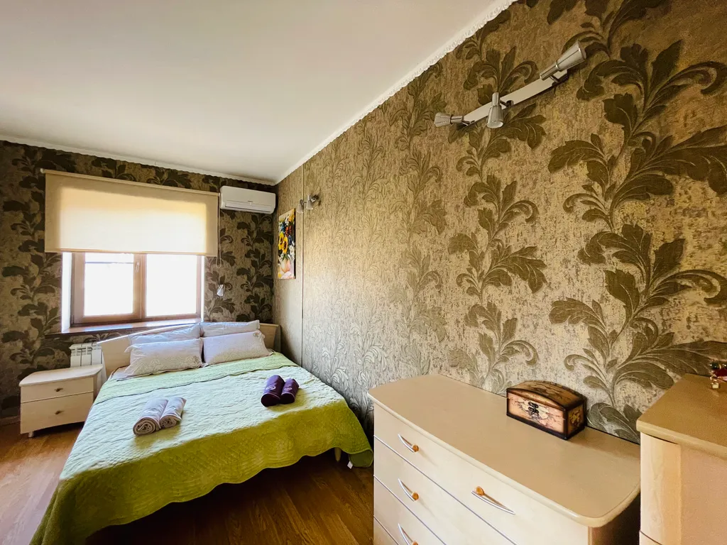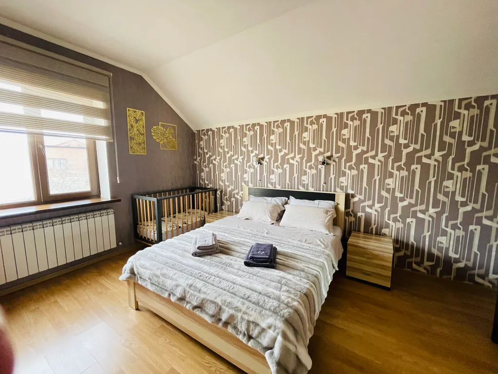 Четыре полноценные просторные спальни, в каждой двуспальные кровати с ортопедическими матрасами, приятное, качественное постельное бельё, вся необходимая мебель. В каждой комнате, а также и на кухне, сплит-система, что не маловажно в сезон, когда температура воздуха доходит до 40 и выше градусов. Так же в каждой комнате и на кухне телевизор. Современная кухня, оснащена всем необходимым и даже больше - зерновая кофе машина, аэрогриль, электрический чайник, тостер, микроволновая печь, электрическая духовка, посудомоечная машина и т. Д. Если вы планируете на отдыхе готовить самостоятельно, то на кухне найдется все что позволит процесс готовки сделать лёгким и быстрым, и не придется сетовать, что нет овощичистки, миксера или отсутствует ёмкость для маринования шашлыка.