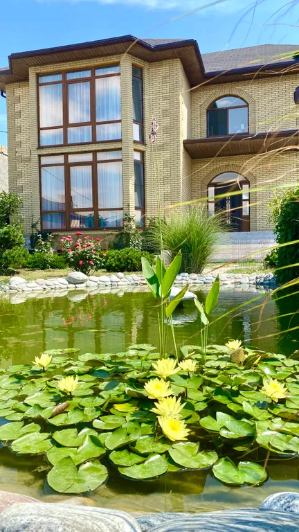 Во дворе пруд с японскими карпами кои, домашний енот в изолированном вольере, множество хвойных деревьев, розы, газон.