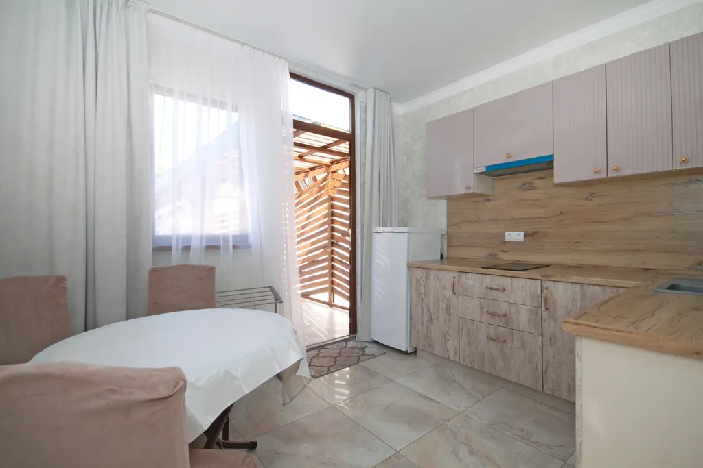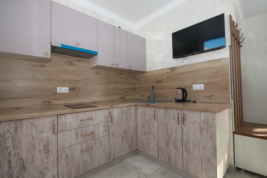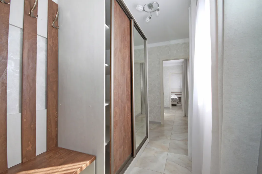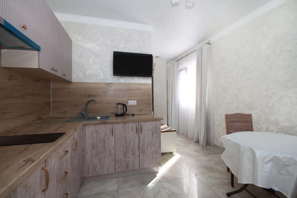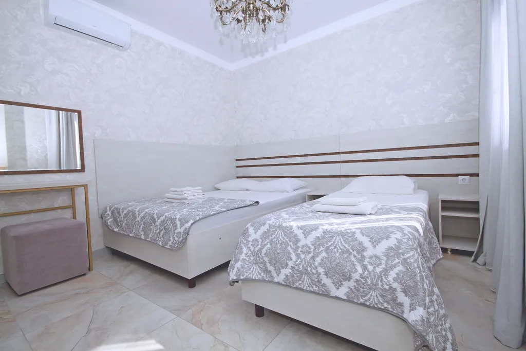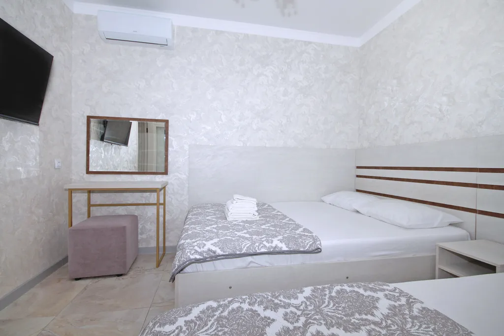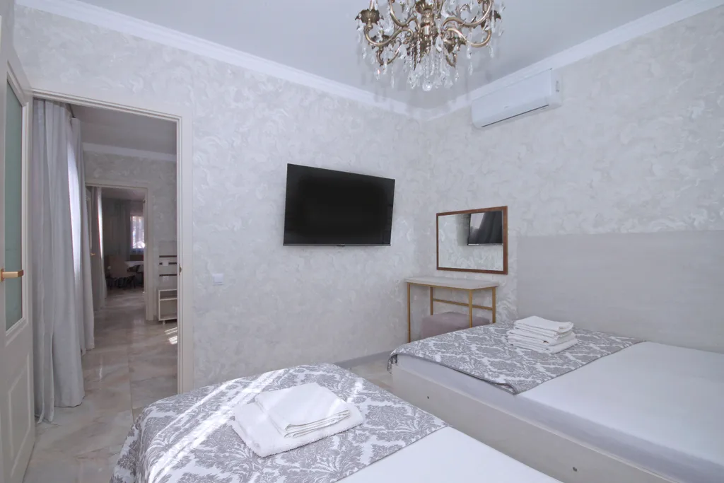 Изолированная спальня (двуспальная + односпальная кровать), проходная комната (двуспальная кровать), тумбы, два телевизора, две сплит-системы, сейф, шкаф, стол, санузел (туалет, раковина, ванна, фен), оборудованная кухня (чайник, варочная панель на 2 конфорки, вытяжка, холодильник, раковина, посуда, обеденный стол со стульями). Евротрешка.