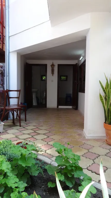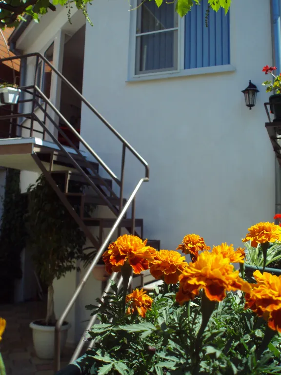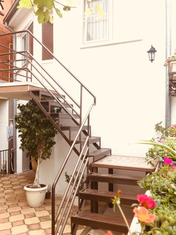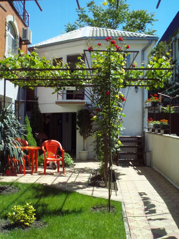 Домик расположен в глубине двора, состоит из двух этажей — на первом этаже комната, туалет и душ, на втором этаже — две комнаты и летняя кухня.