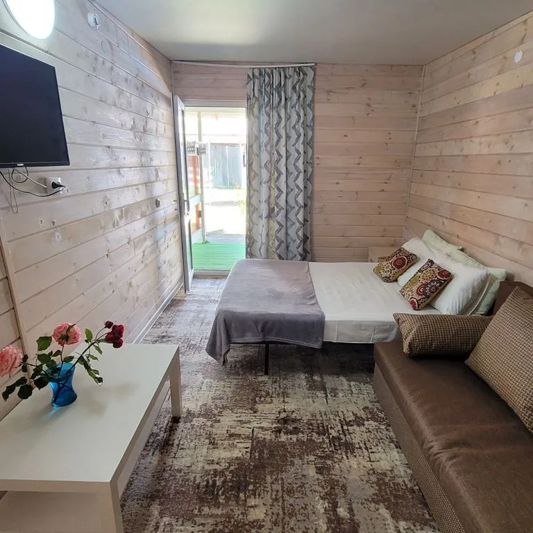 Деревянные домики с отдельным входом и своей терассой находятся в 800 метрах от моря (10 минут пешком). Трёх. Четырёхместные полностью благоустроенные, в номерах свой санузел, душевая кабина, сплит система, холодильник, телевизор, двухспальная кровать и раскладной диван, либо 3 односпальные кровати. Есть двухкомнатные номера с двумя террасами, а также квартиры студии с кухнями. На территории беседка с теннисным столом, батутом, каркасным бассейном, детская игровая площадка, мангальная зона. Рядом с нами в 5 минутах аквапарк и детский парк